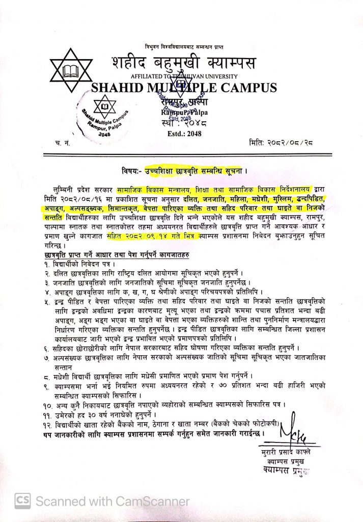 14 Dec लुम्बिनी प्रदेश उच्च शिक्षा छात्रवृत्ति सम्बन्धि सूचना In: Uncategorized By: Shahid Campus 0 Comment 13 Views Share this post: