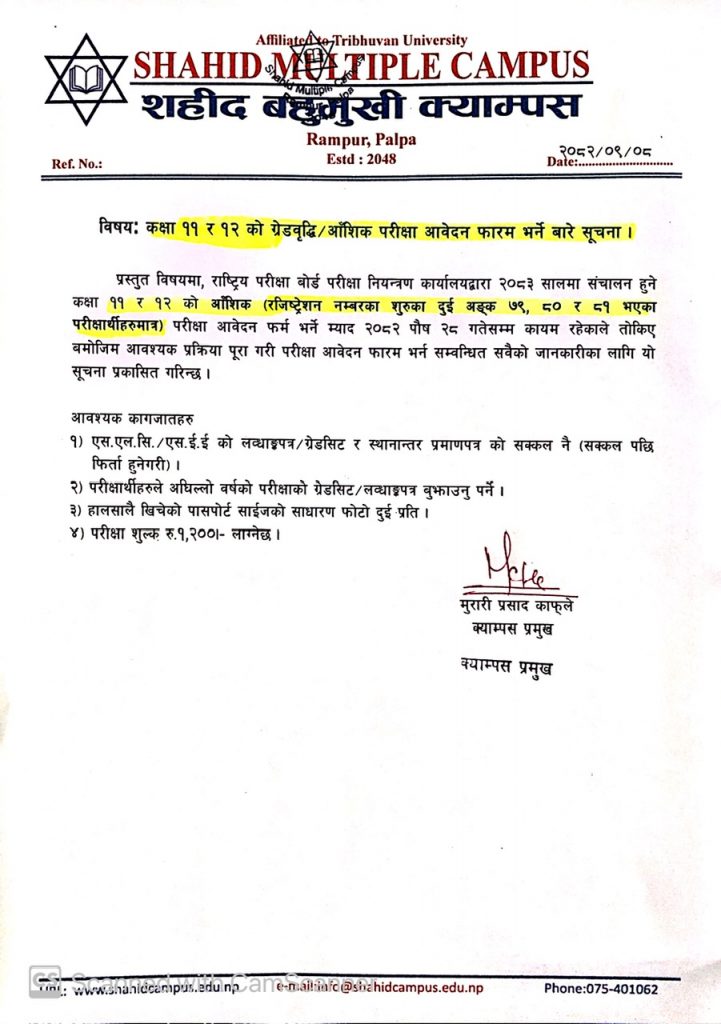 23 Dec कक्षा ११ र १२ को ग्रेड वृद्धि/आँशिक परीक्षा फाराम भर्ने सूचना In: Notice and News By: Shahid Campus 0 Comment 12 Views Share this post: