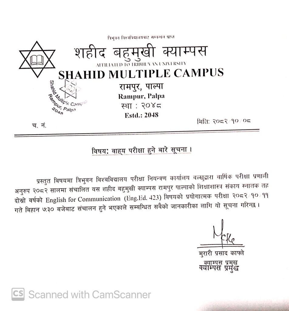 23 Jan Notice about B.Ed. II year Practical exam In: Notice and News By: Shahid Campus 0 Comment 11 Views Share this post: